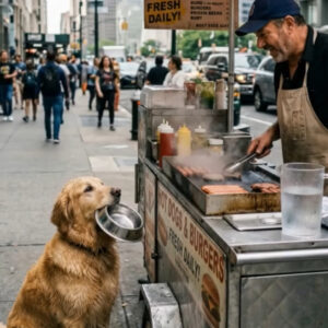 On a busy city sidewalk, surrounded by the noise of traffic and the rush of people passing by, a hungry golden dog slowly approached a small street…