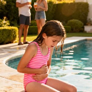 The day my son’s family came to the pool party, my four-year-old granddaughter refused to change and retreated to the bathroom, whispering that she had a stomach…