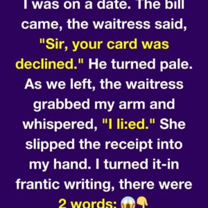 I was on a date. The bill came, the waitress said, “Sir, your card was declined.” He turned pale. As we left, the waitress grabbed my arm…