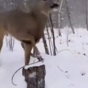The forest was silent under a blanket of snow when the man noticed the deer struggling. A thin wire had caught around its leg, every movement tightening…