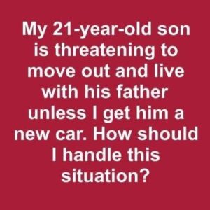 “My 21-year-old son is threatening to move out and live with his father unless I get him a new car. How should I handle this situation?” That’s…