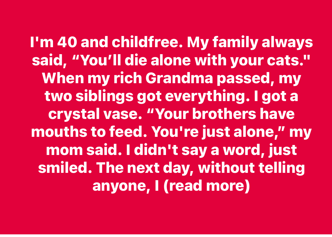 I’m Elena, 40, and I’ve always been honest about not wanting kids. I cherish my freedom, travel frequently, and have built a life that truly makes me happy. But in my family, apparently, happiness only counts if it involves diapers, school runs, and PTA meetings. They joke, “You’ll die alone with your cats.”My two brothers…