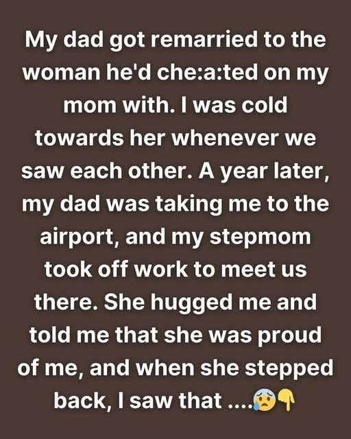 A year later, my dad was taking me to the airport on my way to college, and my stepmom took off work to meet us there and send me off with a care package. She hugged me and told me that she was proud of me, and when she stepped back, I saw that she had tears in her eyes.