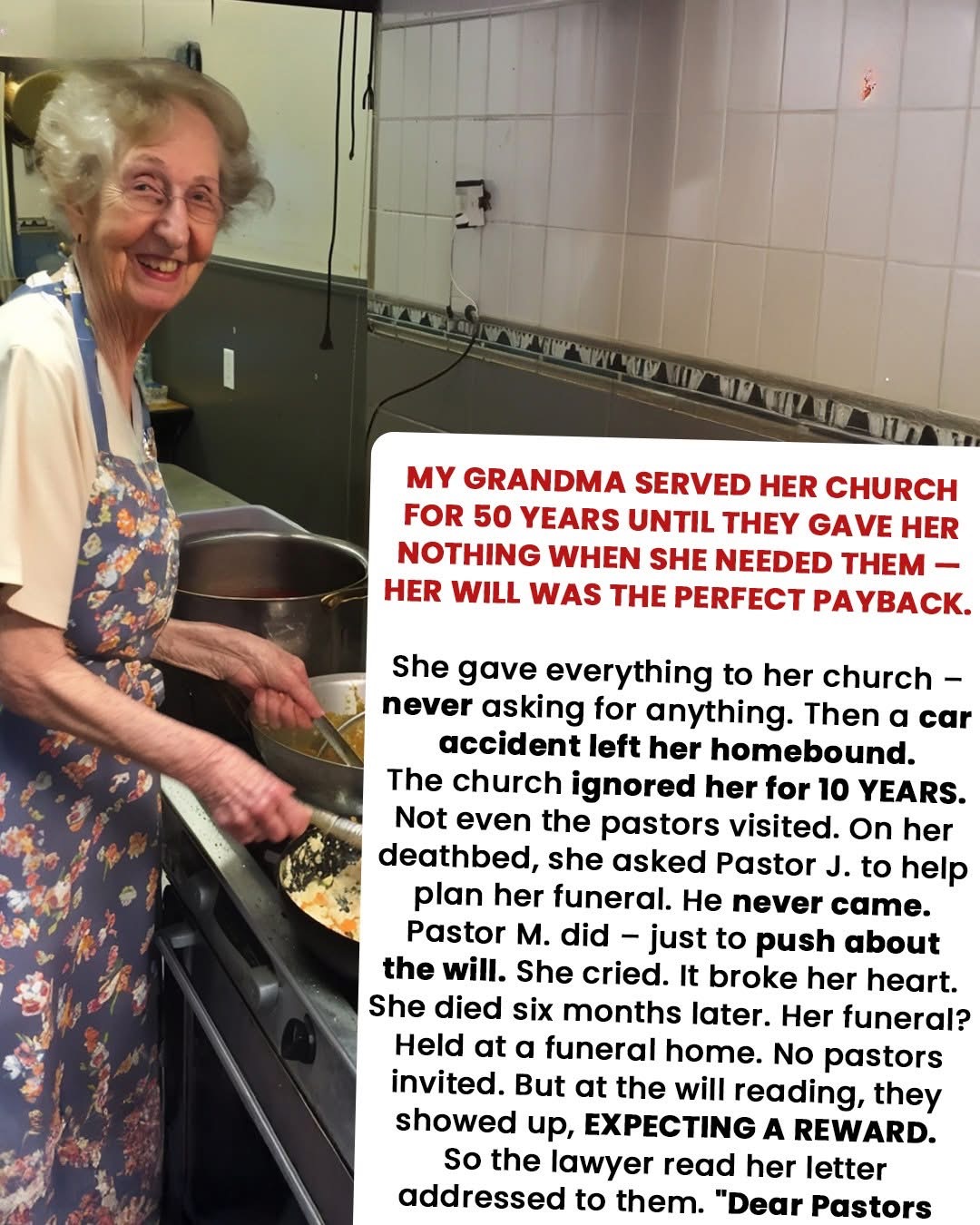 For nearly fifty years, Eleanor devoted her life to her church—teaching, cooking, giving, and loving without hesitation. She was a cornerstone of the congregation, a quiet presence who made others feel seen and valued. But after a devastating car accident left her disabled, the church that had been her home abandoned her. In her time…