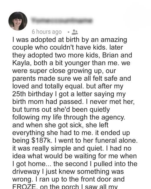 When I turned 25, a lawyer’s letter revealed my birth mother, Alina, had passed away and left me her entire estate worth $187,000. I hoped my adoptive family would share in my bittersweet moment, but instead, I was met with silence and resentment. My siblings, Brian and Kayla, demanded I split the inheritance. Even my…