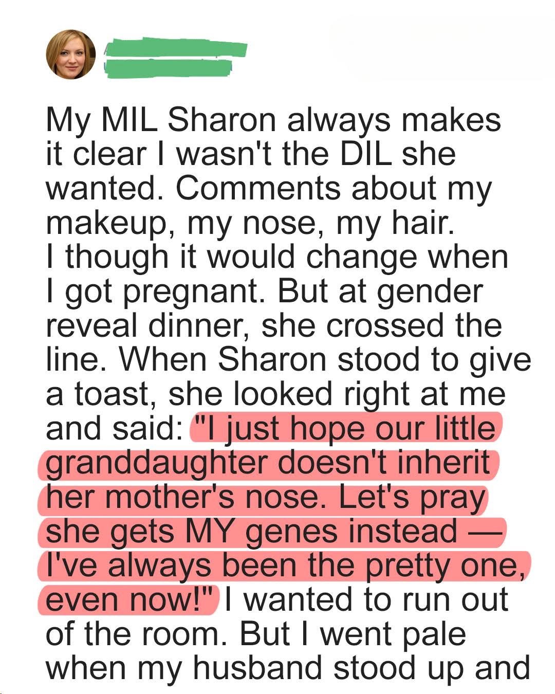 From the moment I married Jake, his mother Sharon made it clear I wasn’t the daughter-in-law she wanted. Her passive-aggressive remarks about my appearance came disguised as “concern,” but I let it go — mostly for Jake’s sake. When I got pregnant, Sharon suddenly became very involved. She insisted on throwing us a “small” gender…