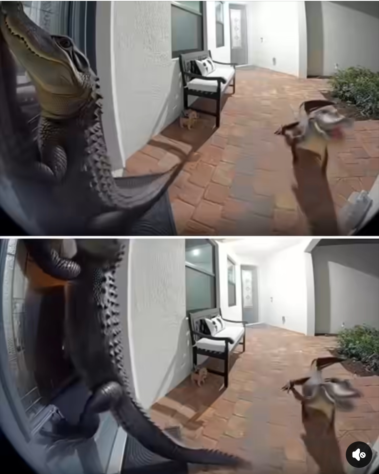 Captured on a Ring doorbell camera, the bizarre footage shows a pair of massive alligators making their way up a quiet family’s front porch. At first, it looks like a scene from a wildlife documentary.