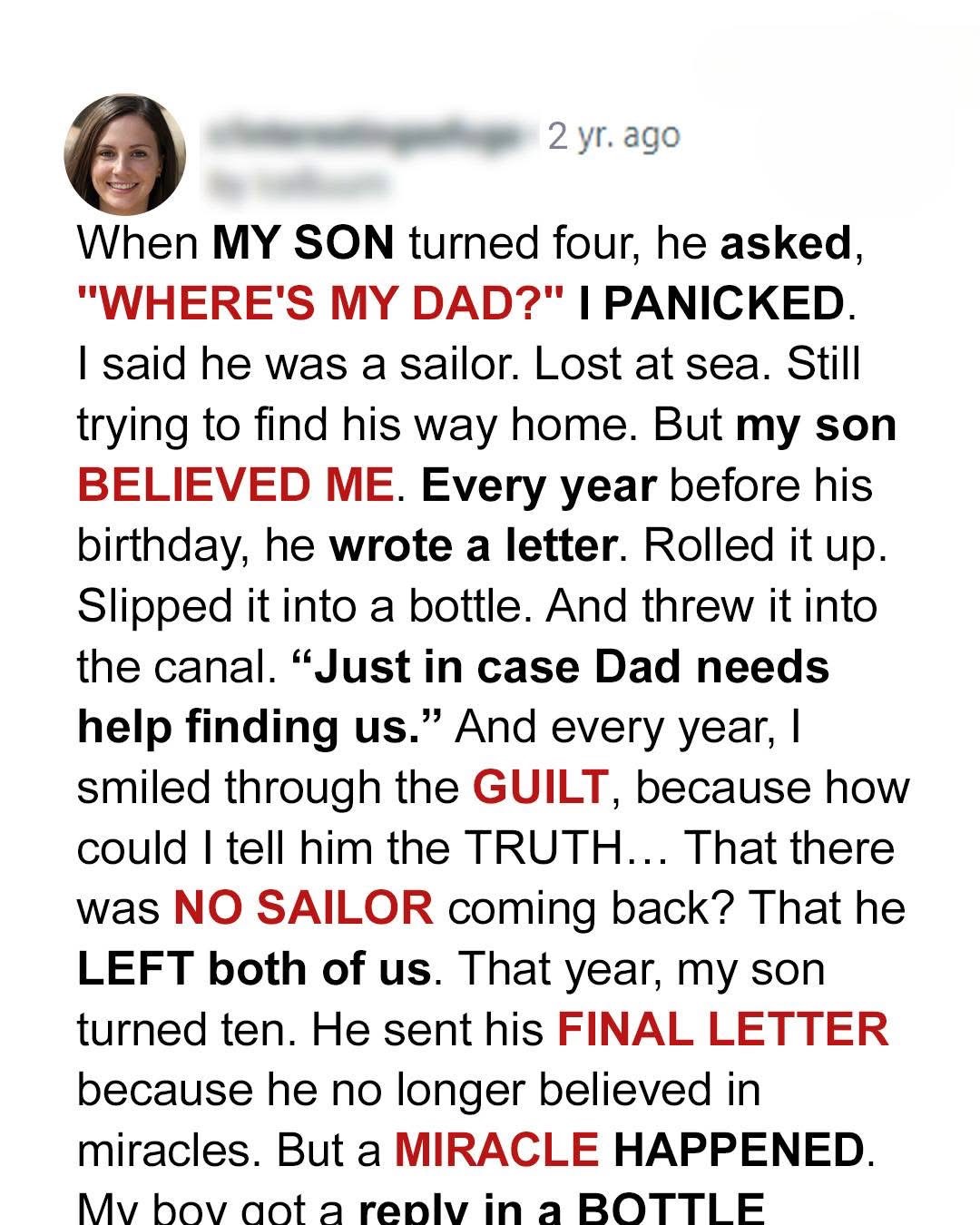 My son Tommy never knew his father. To ease his pain, I told him stories of a brave sailor who had simply gotten lost at sea but would one day return. Each year, Tommy wrote a letter, tucked it inside a bottle, and set it adrift—believing it would eventually reach his dad. At four, the…