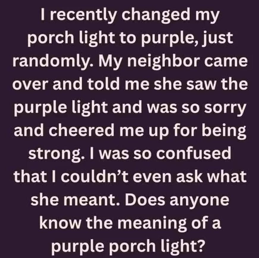 That soft purple glow on a porch at night is more than decoration — it’s a quiet but powerful symbol of support for survivors of domestic violence.