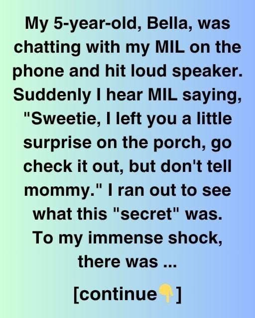 My 5-year-old, Bella, was chatting with my MIL on the phone and hit loudspeaker. Suddenly, I heard her grandmother’s voice say, “Sweetie, I left you a little surprise on the porch. Go check it out, but don’t tell Mommy.” My heart sank. I rushed to the door, unsure what I’d find. To my immense shock,…
