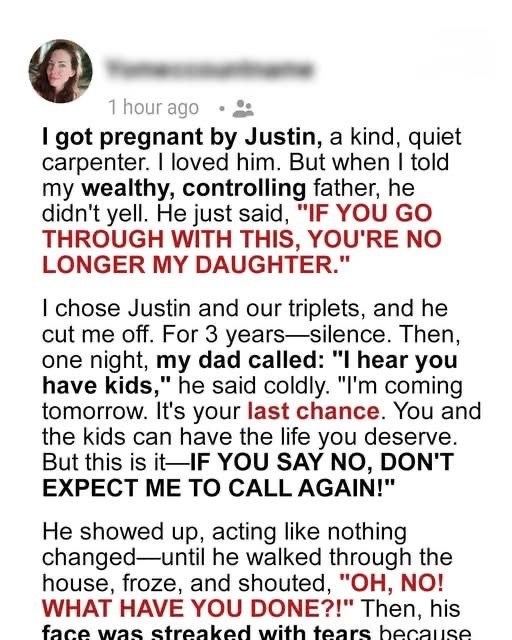 When I told my dad I was pregnant by Justin—a quiet carpenter—he disowned me. For three years, silence. No calls. No visits. Then he reappeared, suitcase in hand, offering money and a “better life.” He toured our modest home, paused at a photo of my late mother, and broke. She had wanted a simple, handmade life, not the marble floors he’d chosen for her. “She would have loved this,” he whispered.