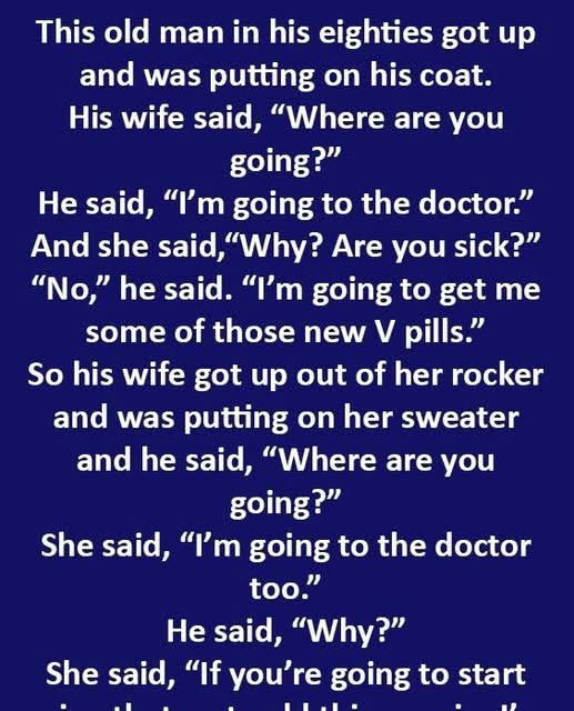 This old man in his eighties got up and was putting on his coat. His wife said, “Where are you going?” He said, “I’m going to the doctor.”