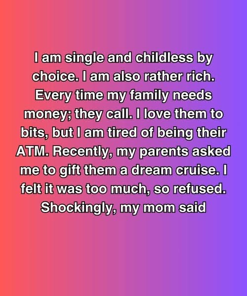 I am single and childless by choice. I am also rather rich. Every time my family needs money, they call. I love them to bits, but I am tired of being their ATM. Recently, my parents asked me to gift them a dream cruise. I felt it was too much, so refused. Shockingly, my mom said, “You wouldn’t understand what it means to have a family. You only have money.”