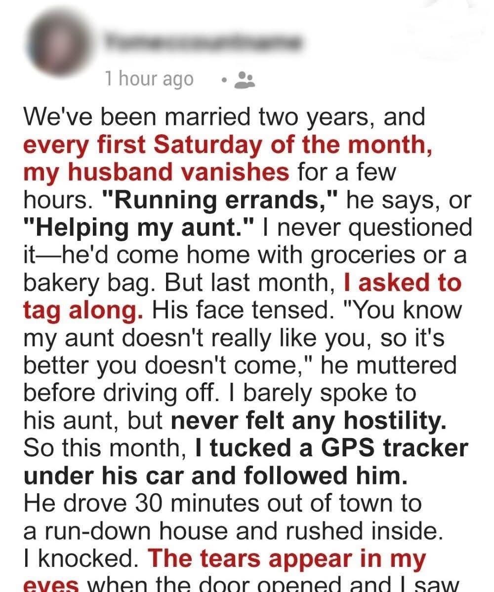 We’ve been married two years, and every first Saturday of the month, my husband vanishes for a few hours. ‘Running errands,’ he says, or ‘Helping my aunt.’ I never questioned it—he’d come home with groceries or a bakery bag. But last month, I asked to tag along. His face tensed. ‘You know my aunt doesn’t really like you, so it’s better you don’t come,’ he muttered before driving off. I barely spoke to his aunt but never felt any hostility.