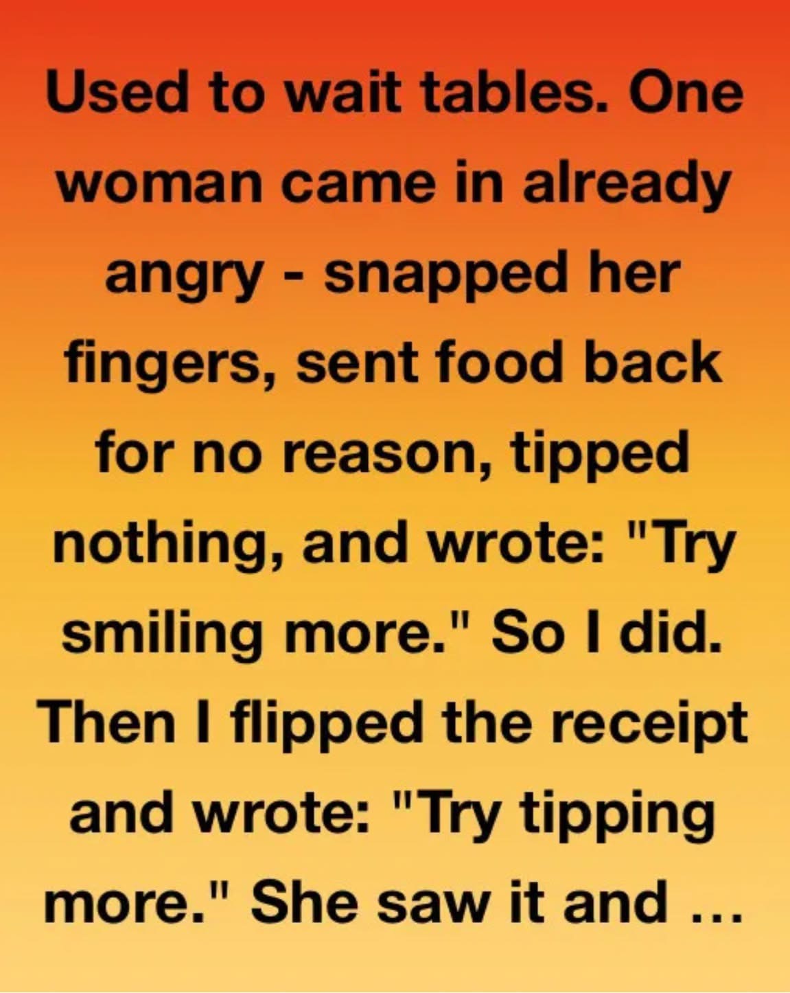 Used to wait tables. One woman came in already angry — snapping her fingers at me, sending her food back twice for no reason, and glaring at me the entire time. By the end of her meal, she tipped nothing and left a note on the receipt that read: “Try smiling more.” I was exhausted but kept my cool. I forced the biggest smile I could, walked to the back of the restaurant, and took a deep breath.Then, instead of letting her negativity get to me, I decided to respond in a calm but honest way. I flipped the receipt over and wrote: “Try tipping more.” When I walked back to the table, I placed it gently in front of her and wished her a good evening, still wearing that same forced smile. A few minutes later, she came up to the counter.