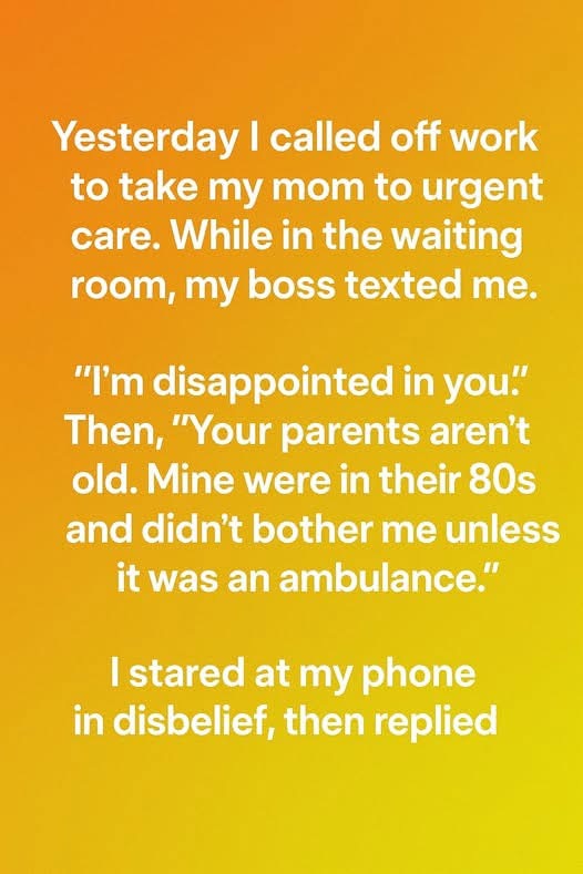 Yesterday, I had to call off work unexpectedly to take my mom to urgent care. She wasn’t feeling well, and her symptoms had come on suddenly. I didn’t want to risk waiting, so I canceled my day and rushed her to the clinic. While sitting in the waiting room, my heart raced as I kept glancing over at her. She tried to smile, insisting she’d be fine, but I could see the worry in her eyes. Just then, my phone buzzed. It was a message from my boss. “I’m disappointed in you,” it read.