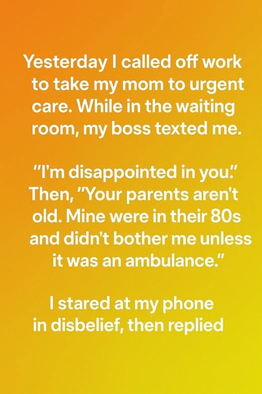 Yesterday, I had to call off work unexpectedly to take my mom to urgent care. She wasn’t feeling well, and her symptoms had come on suddenly. I didn’t want to risk waiting, so I canceled my day and rushed her to the clinic. While sitting in the waiting room, my heart raced as I kept glancing over at her. She tried to smile, insisting she’d be fine, but I could see the worry in her eyes. Just then, my phone buzzed. It was a message from my boss. “I’m disappointed in you,” it read.