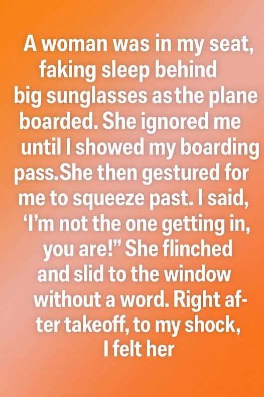 A woman was in my seat, faking sleep behind big sunglasses as the plane boarded. She ignored me until I showed my boarding pass. She then gestured for me to squeeze past. I said firmly, “I’m not the one getting in, you are!” She flinched and slid over to the window without a word. I sat down, slightly annoyed but ready to enjoy my flight.