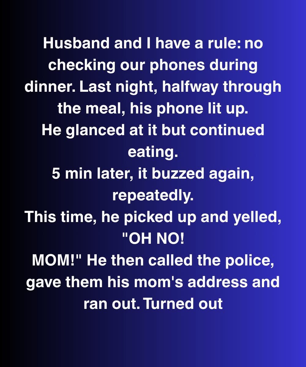 Husband and I have a rule: no checking our phones during dinner. Last night, halfway through the meal, his phone lit up. He glanced at it but continued eating. Five minutes later, it buzzed again, repeatedly. This time, he picked up and yelled, “OH NO! MOM!” He then called the police, gave them his mom’s address and ran out. Turned out she had slipped in her kitchen, knocked her head, and couldn’t move. Her neighbor had found her struggling and was calling from her phone.