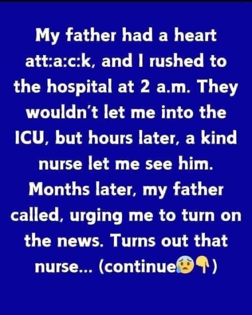 My father had a heart atta:ck, and I rushed to the hospital at 2 a.m. They wouldn’t let me into the ICU, but hours later, a kind nurse let me see him. Months later, my father called, urging me to turn on the news. Turns out that the nurse wasn’t a nurse at all.