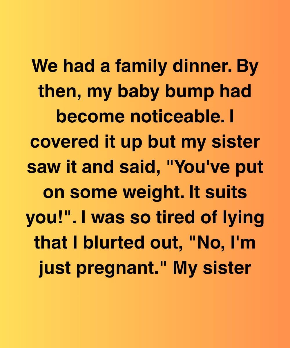 We had a family dinner. By then, my baby bump had become noticeable. I covered it up but my sister saw it and said, “You’ve put on some weight. It suits you!” I was so tired of lying that I blurted out, “No, I’m just pregnant.”