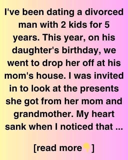 I’ve been dating a divorced man with 2 kids for 5 years. This year, on his daughter’s birthday, we went to drop her off at his mom’s house. I was invited in to look at the presents she got from her mom and grandmother. My heart sank when I noticed that one of the gifts—an art set in a pink case—was one I had bought and wrapped just a week earlier.