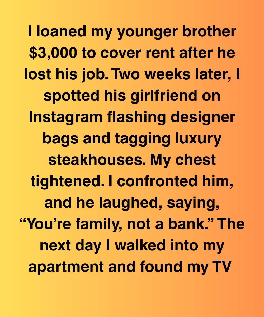 I loaned my younger brother $3,000 to cover rent after he lost his job. Two weeks later, I spotted his girlfriend on Instagram flashing designer bags and tagging luxury steakhouses. My chest tightened. I confronted him, and he laughed, saying, “You’re family, not a bank.” The next day I walked into my apartment and found my TV missing.