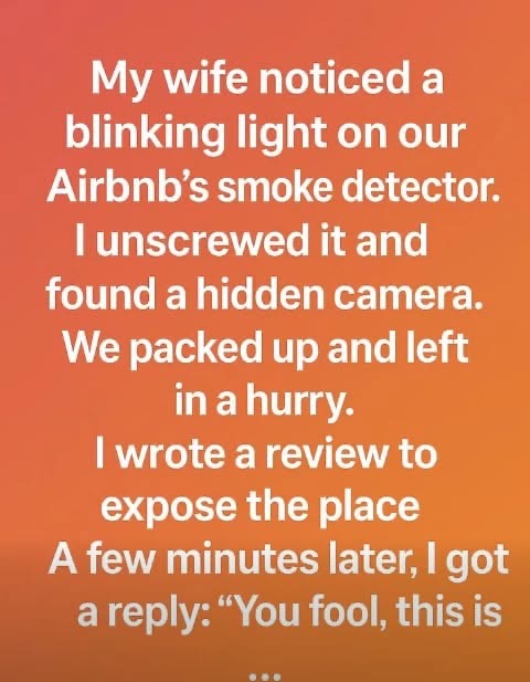 My wife noticed a blinking light on our Airbnb’s smoke detector. I unscrewed it and found a hidden camera. Heart racing, I showed her, and we packed up our belongings in a hurry, leaving immediately. We were shaken, and on the drive away, I wrote a scathing review to expose the place, warning others to stay away.