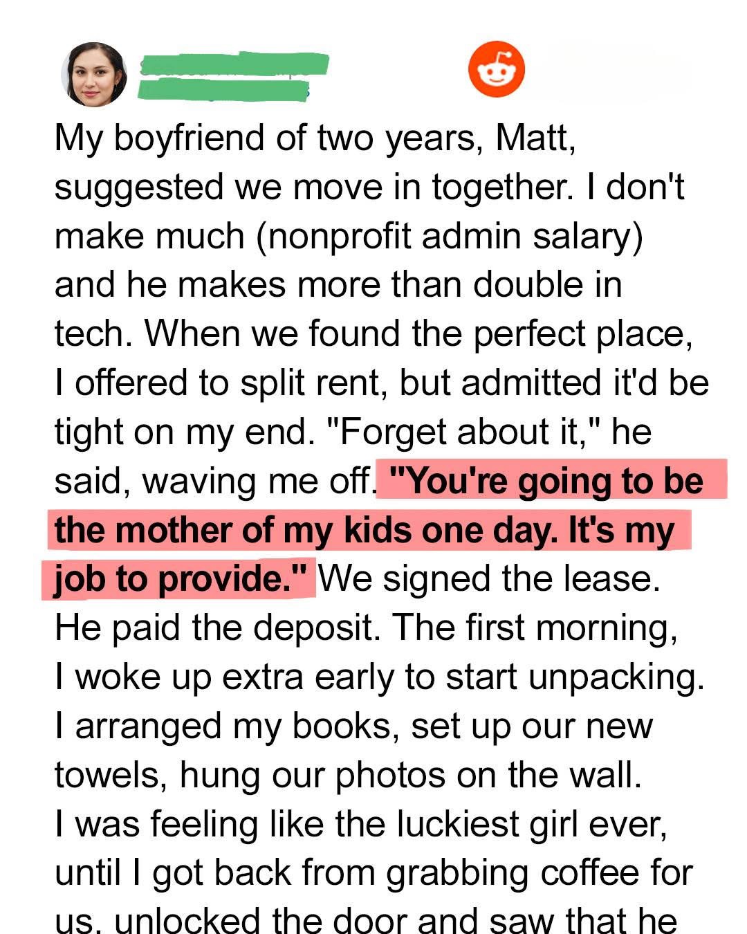 But things changed the day we moved in. While I was out getting lunch, Matt rearranged everything—my books, plants, and personal items were shoved into a closet. The rest of the apartment was filled with only his belongings. When I asked about it, he said, “I’m paying the rent, so my stuff comes first,” and added I should be cooking as thanks.