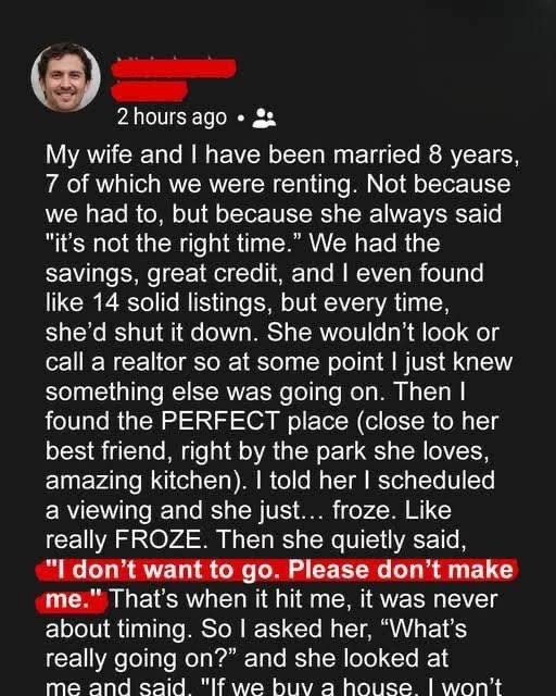 Jane and I had been married for eight years, but for seven of them, she refused to even consider buying a house. We had the savings, good credit, and stability to make it happen, yet every time I brought it up, she would quietly say, “It’s not the right time.” At first, I assumed it…