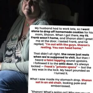 My husband had to work late, so I went alone to drop off homemade cookies for his mom, Sharon. When I got there, my FIL Frank wasn’t…