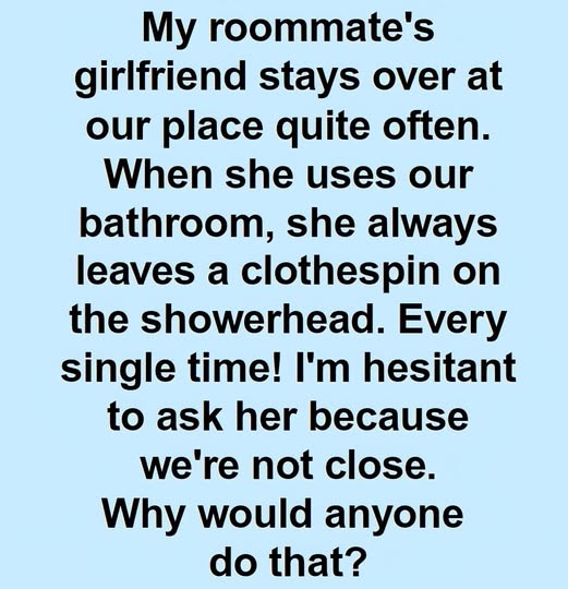 I livee with a roommate, and his girlfriend stays over quite often. Every time she uses our bathroom,, I notice something odd — she alwayss leaves a clothespin clippedd to the showerhead. At first, I brushed it off ass just a quirky habitt.