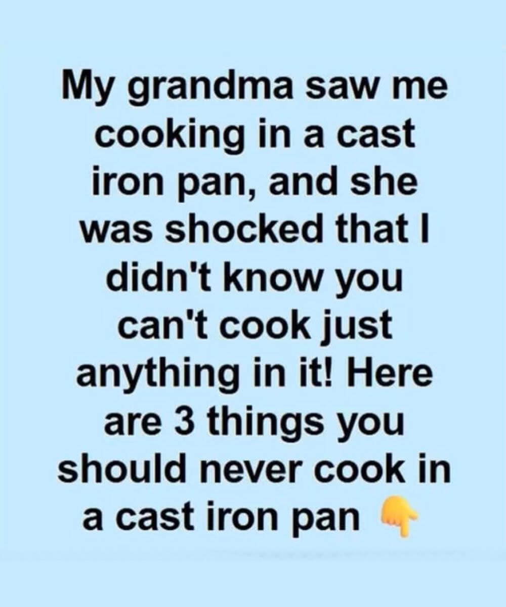 My grandma saw me cooking in a cast iron pan, and she was shocked that I didn’t know you can’t cook just anything in it! Here are 3 things you should never cook in a cast iron pan.