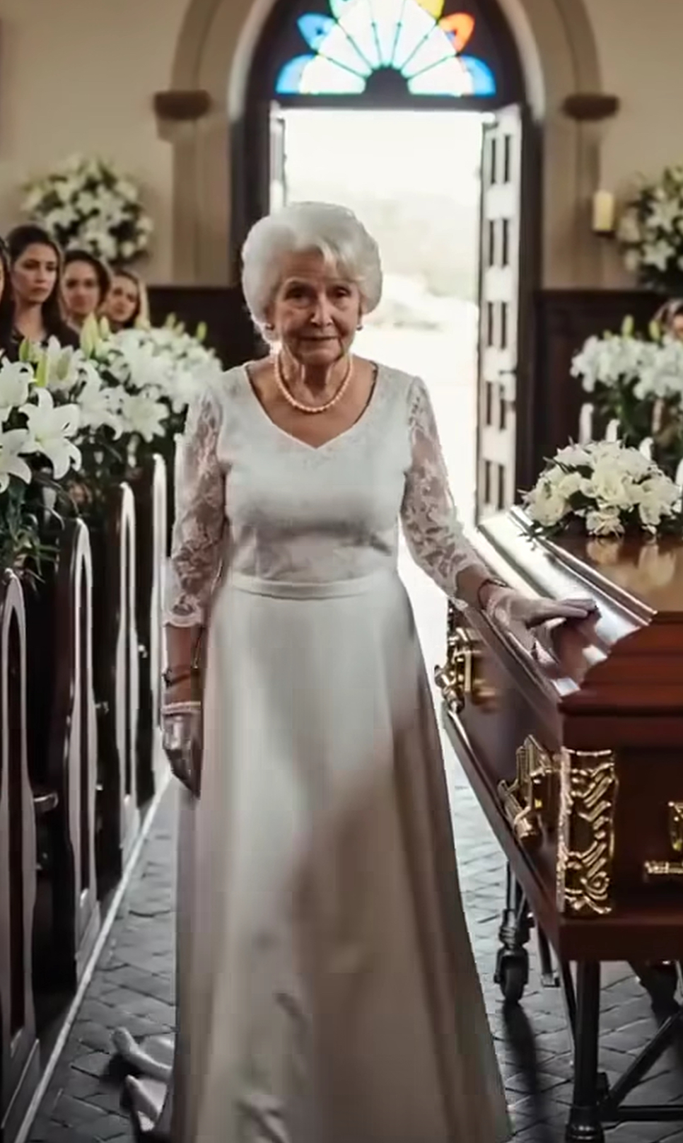 She appeared slowly, an older woman—perhaps 70—wearing a sleek, modest wedding gown. Laced sleeves, high collar, delicate gloves. Her hair was pinned neatly, and her face glowed with a mix of sorrow and certainty.