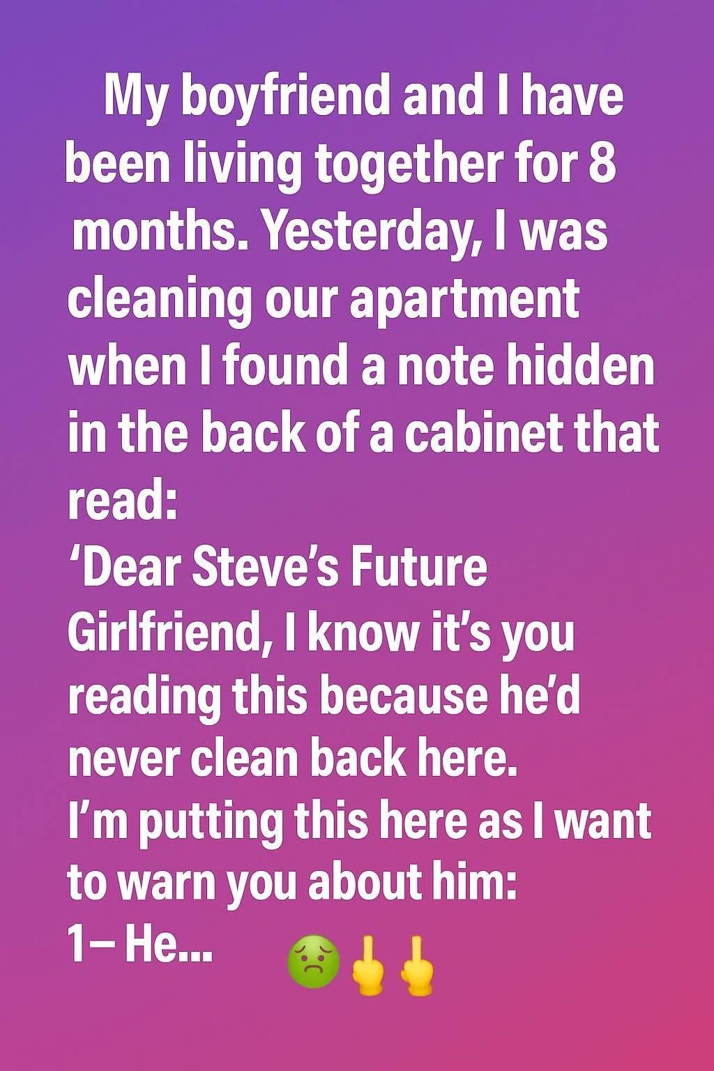 My boyfriend and I had been living together for eight months. Yesterday, while doing a deep clean of our apartment, I stumbled upon something I never expected. Hidden behind the back of a kitchen cabinet was a folded piece of paper, yellowed at the edges. Curious, I opened it and found a handwritten note that…