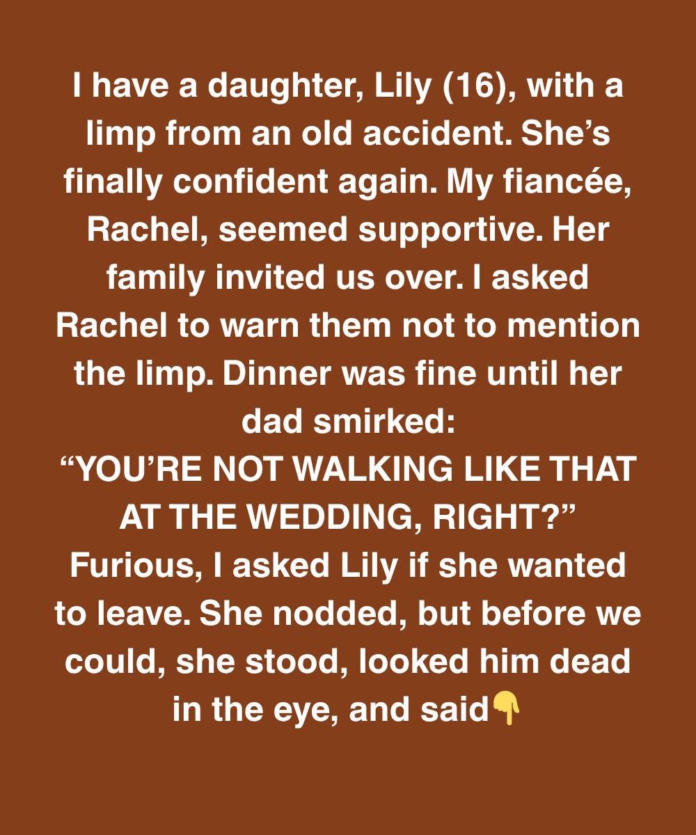 She’s Finally Confident Again. My Fiancée, Rachel, Seemed Supportive. Her Family Invited Us Over. I Asked Rachel To Warn Them Not To Mention The Limp. Dinner Was Fine Until Her Dad Smirked: “You’re Not Walking Like That At The Wedding, Right?” Furious, I Asked Lily If She Wanted To Leave. She Nodded, But Before We Could, She Stood, Looked Him Dead In The Eye, And Said, “I’ll Walk However I Want, And I’ll Still Be Better Than You.” The room fell silent. You could almost hear everyone’s heart beating. My fiancée’s face turned pale, and her mother looked like she wanted to crawl under the table. I reached for Lily’s hand, but she shook her head and stood taller, even though I could see the pain flashing across her face with every second on her feet.