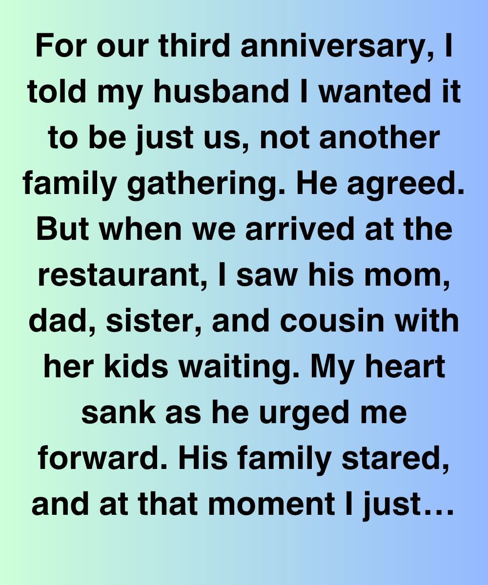 our third anniversary, I told my husband I wanted it to be just us, not another family gathering. He agreed. But when we arrived at the restaurant, I saw his mom, dad, sister, and cousin with her kids waiting. My heart sank as he urged me forward. His family stared, and at that moment I just froze. I felt like an ornament being placed where it was supposed to go, not a wife being cherished. As we sat down, his mother waved me over to a seat right next to her. She started telling me how proud she was of her son and how she always knew he’d marry someone who “fit right into their family traditions.”