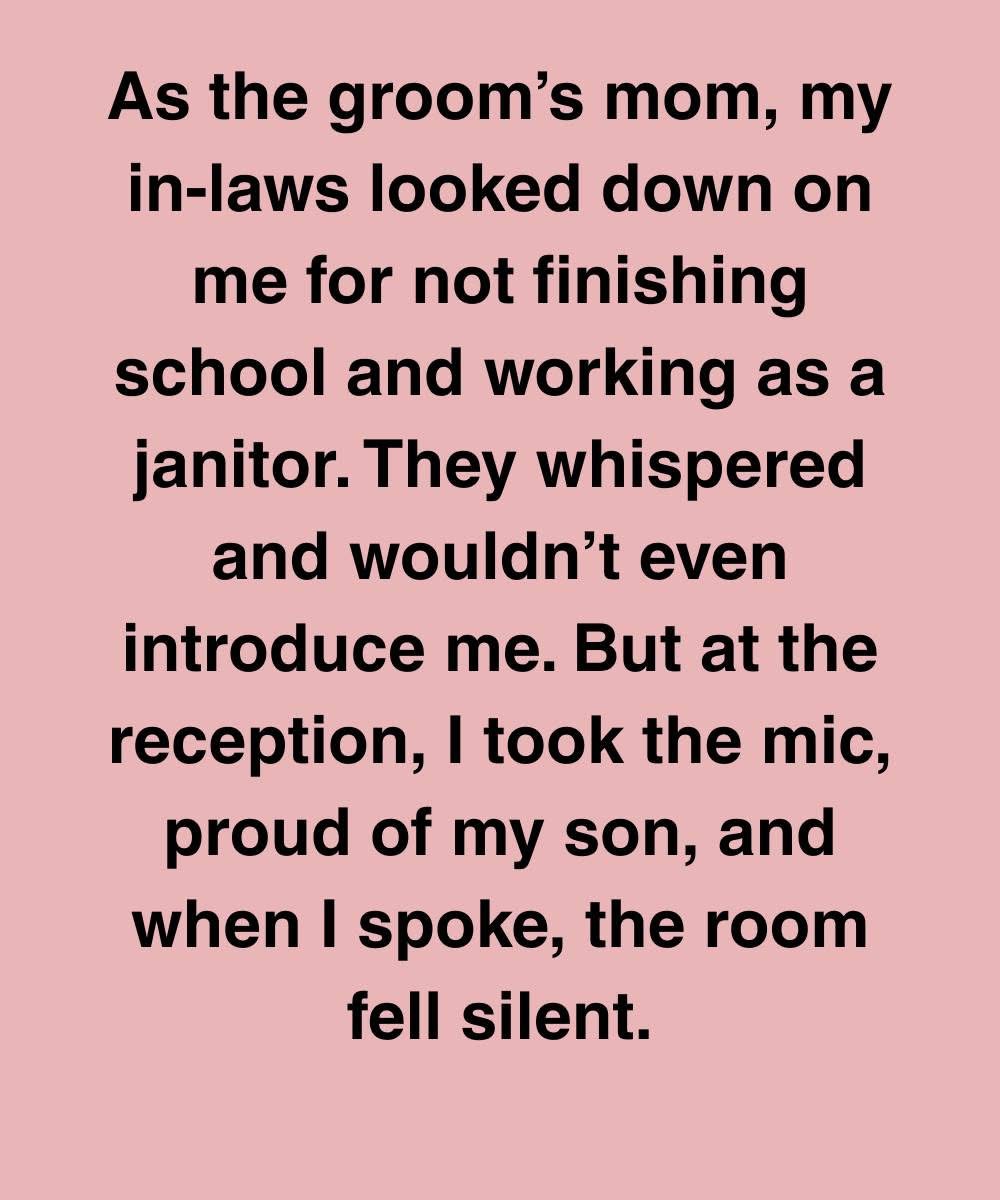 As the groom’s mom, my in-laws looked down on me for not finishing school and working as a janitor. They whispered and wouldn’t even introduce me. But at the reception, I took the mic, proud of my son, and when I spoke, the room fell silent.