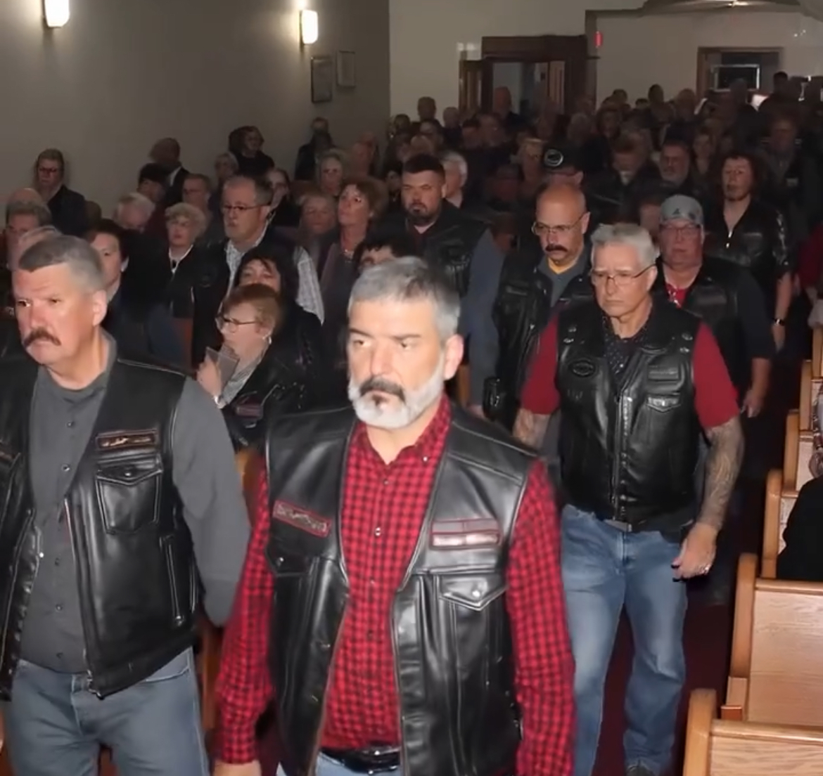 They parked in formation, blocking the church entrance. Men and women in leather and denim dismounted, forming a silent wall. No shouting. No weapons. Just grim determination.