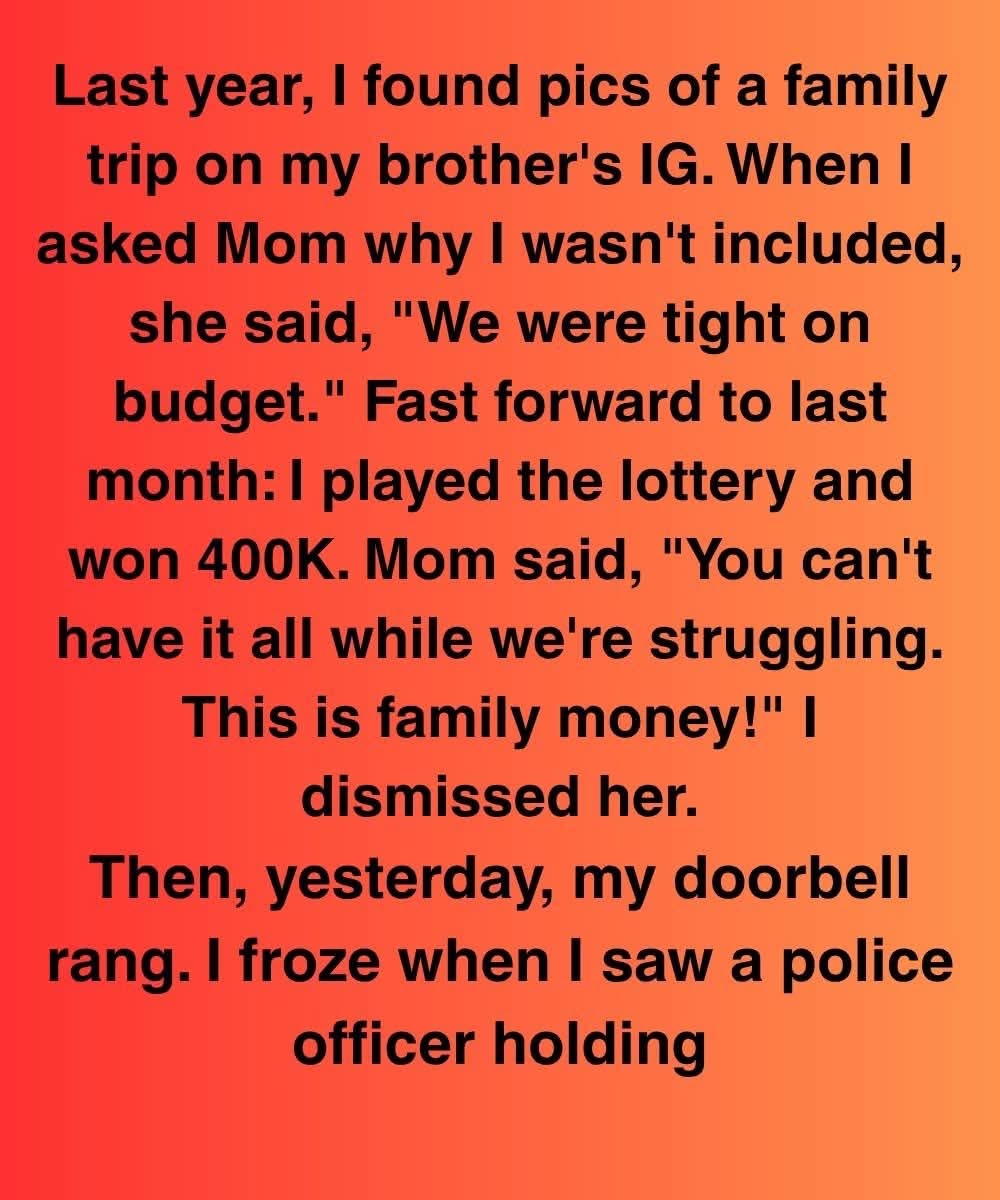 Last year, I found pics of a family trip on my brother’s IG. When I asked Mom why I wasn’t included, she said, “We were tight on budget.” Fast forward to last month: I played the lottery and won 400K. Mom said, “You can’t have it all while we’re struggling. This is family money!” I dismissed her.