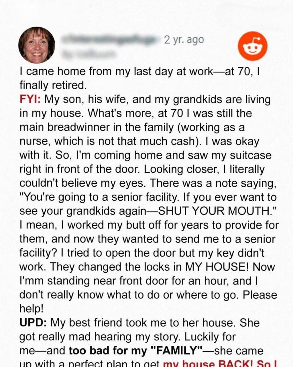 After working for nearly four decades at the same clinic, I finally retired at seventy. My colleagues threw a small farewell party filled with laughter, cake, and warm memories. On the way home, I picked up a strawberry cream cake, thinking I’d surprise my family and celebrate this new chapter together. But when I arrived, something felt wrong—the front door was locked, and my suitcases sat neatly on the porch. I realized in an instant that life, after retirement, was about to change in ways I never imagined.