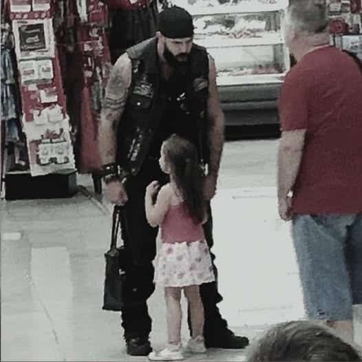 The knock of shopping carts and fluorescent hum made the Walmart feel ordinary—until a six-year-old girl ran straight into the arms of a giant biker in a Demons MC vest and clung to him like a life raft.