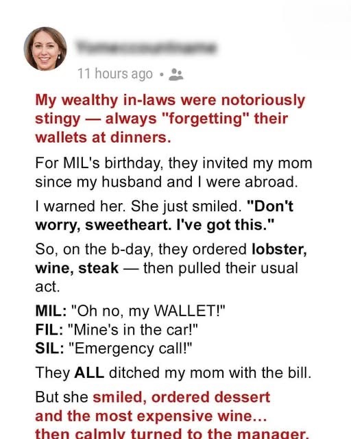 Every family has that one unspoken habit — the thing everyone knows about but no one has the courage to call out. In my husband’s family, it was money. His parents had a talent for “forgetting” their wallets at restaurants, despite being comfortably wealthy. Birthdays, holidays, anniversaries — someone else always ended up paying. They’d…