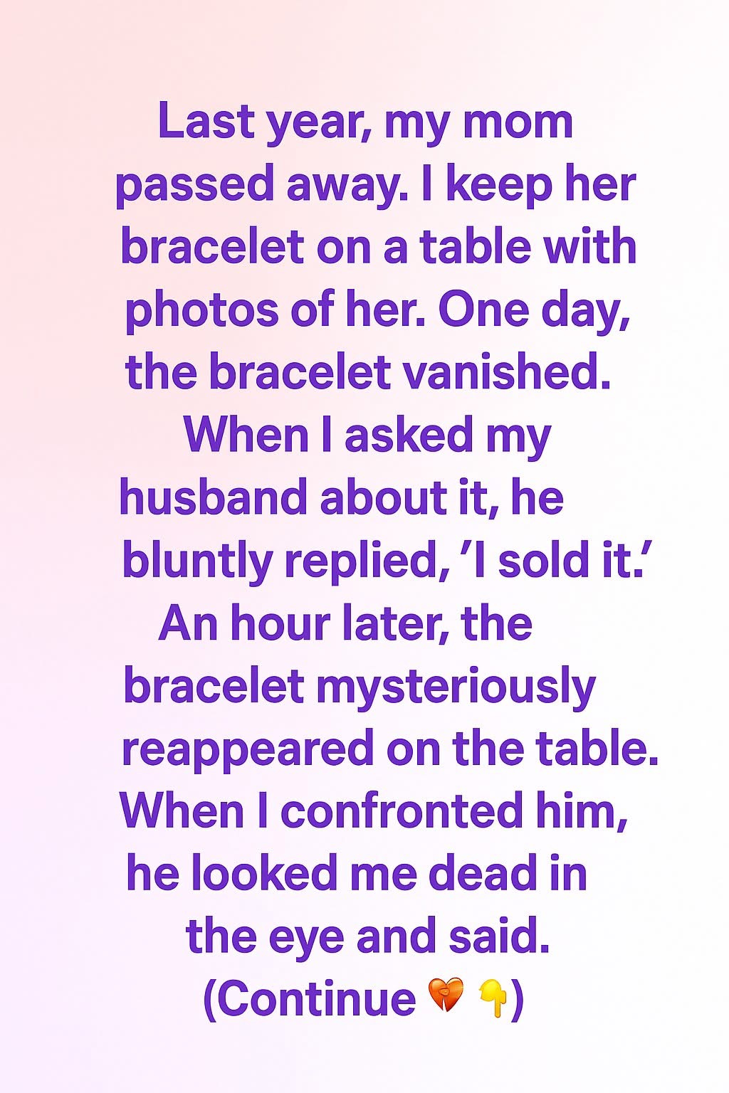 One morning, I noticed the bracelet was gone. My heart sank. I searched everywhere — under the table, in drawers, even inside the couch cushions — but it was nowhere to be found. Confused and upset, I asked my husband if he’d seen it. Without hesitation, he said, “I sold it,” and walked away. My chest tightened. I couldn’t believe he’d say something like that about something so precious. I felt hurt and betrayed.
