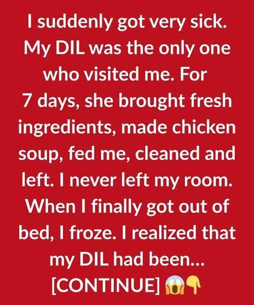 I suddenly got very sick. My DIL was the only one who visited me. For 7 days, she brought fresh ingredients, made chicken soup, fed me, cleaned and left. I never left my room. When I finally got out of bed, I froze. I realized that my DIL had been quietly taking care of the entire house while I was resting—laundry folded, dishes washed, floors cleaned, even fresh flowers placed in a vase by the living room window.