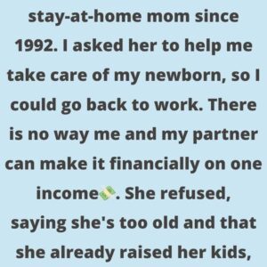 My mom is 64, she has been a stay-at-home mom since 1992. I asked her to help me take care of my newborn, so I could go…