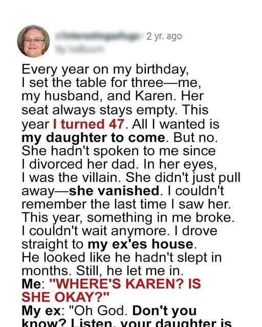 On my 47th birthday, I set the table for three. One seat remained empty, as it had for the past two years—quietly waiting. My daughter, Karen, hadn’t spoken to me during that time. Still, every year, I laid out her plate, a small act of hope I couldn’t let go of. Brad, my husband, noticed…