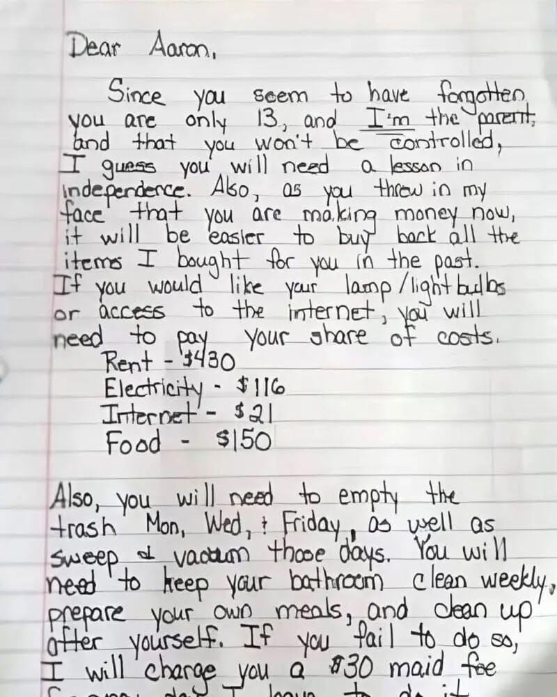 In her letter, she directly addressed her 13-year-old son, criticizing him for treating her as a “roommate” instead of a parent.