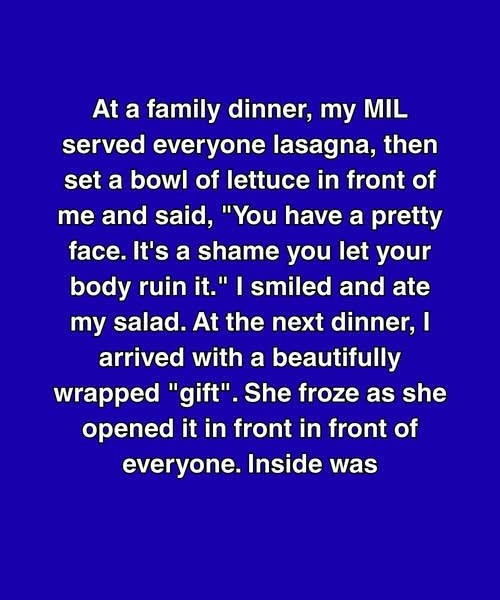 At a family dinner, my MIL served everyone lasagna, then set a bowl of lettuce in front of me and said, “You have a pretty face. It’s a shame you let your body ruin it.” I smiled and ate my salad. At the next dinner, I arrived with a beautifully wrapped “gift”. She froze as she opened it in front of everyone. Inside was a handwritten journal titled: “Words That Hurt & Words That Heal – For Families Who Want to Grow Closer.”
