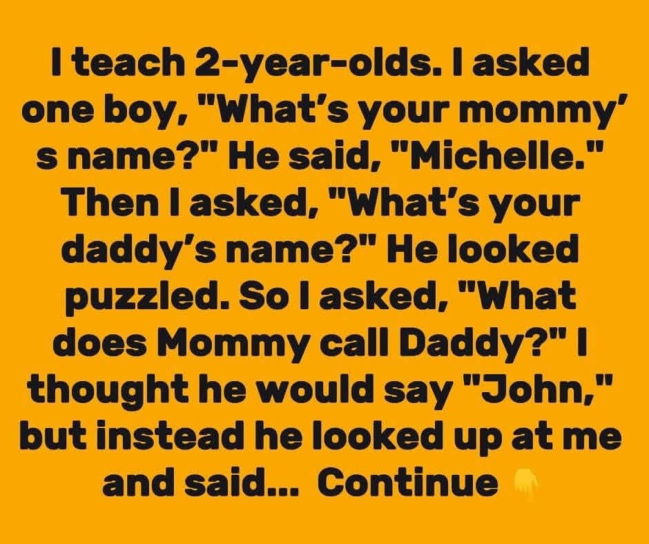 I teach 2-year-olds, and every day brings a new surprise. One morning, during circle time, I decided to learn more about my students’ families. I asked one little boy, “What’s your mommy’s name?” Without hesitation, he replied, “Michelle.” Smiling, I continued, “And what’s your daddy’s name?” He frowned slightly, deep in thought, clearly unsure of the answer. Hoping to help him remember, I asked, “Well, what does Mommy call Daddy?”